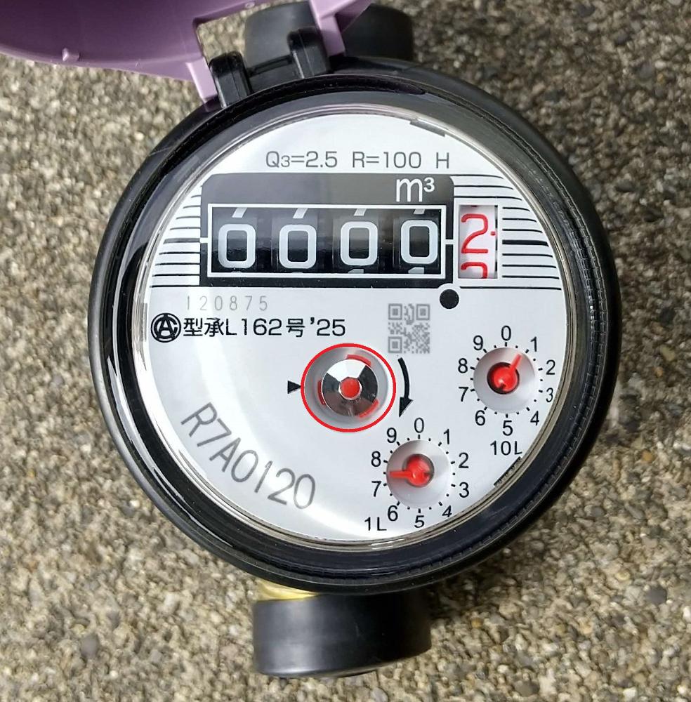 2.水道メーターのパイロット※(下図参照)が回っていないかどうかをしばらく確認してください。